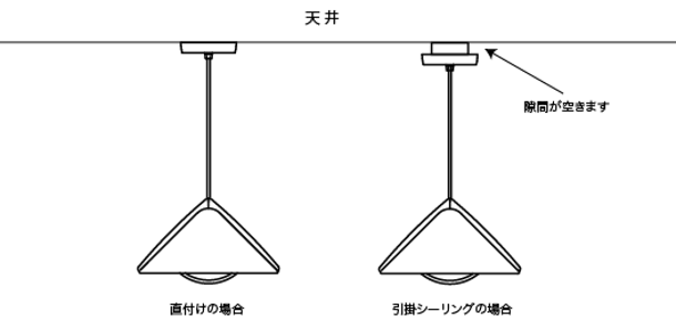 引掛シーリングでの取付の場合は、天井とプレートの間に隙間(1cm〜2.5cm)が出来ますのでご了承下さい。