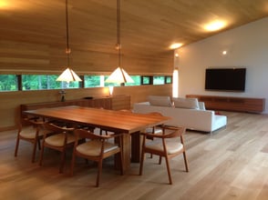 広めのダイニングスペースにも十分な大きさのダイニングテーブル。材質は重厚感のあるチーク材を使用。サイズ、材質は変更可能です。