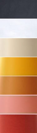 上から順に、Graphite、Ivory、Sand、Sun、Honey、Powder rose、Rasberryの7色。
