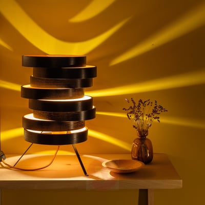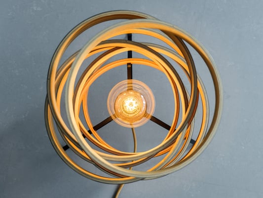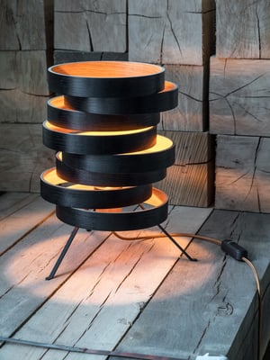 シンプルな木製のリングを組み合わせた躍動感溢れるデザインのテーブルランプ。