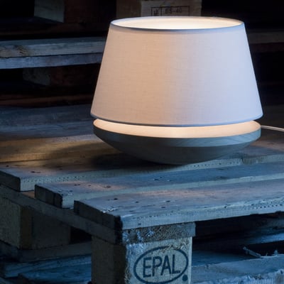 重量感のあるオーク材の丸みを帯びたフォルムのベースと、最高品質のリネンのシェードのから放たれるやわらかな光が印象的なデザイン。